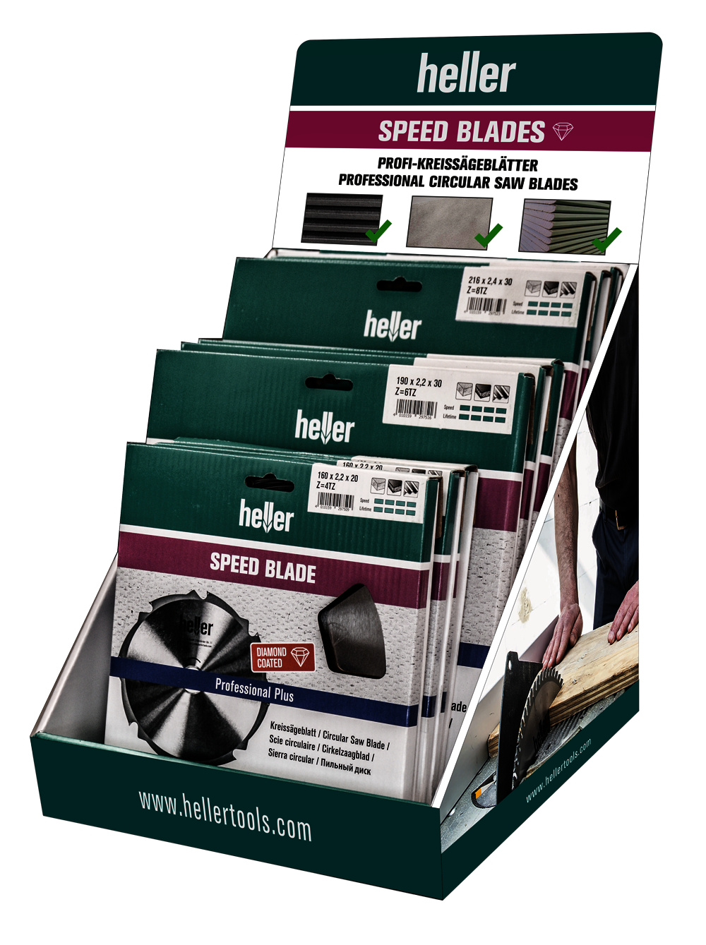 The Heller premium circular saw blades "Speed Blades" are reliable, durable, fast and flexible to use. The product segment, which was newly established in 2018, is constantly being further developed. Most recently, Heller has included diamond-coated blades that are ideally suited for use in fibre cement, gas concrete, plasterboard and much more. The company is currently offering these new products in an attractive display for flexible and eye-catching presentation at the POS at a package price. More information is available at info@hellertools.com.